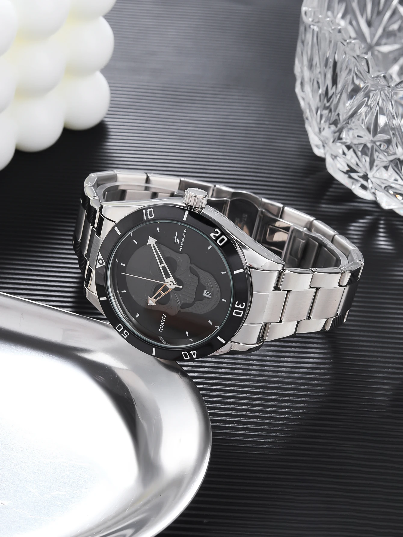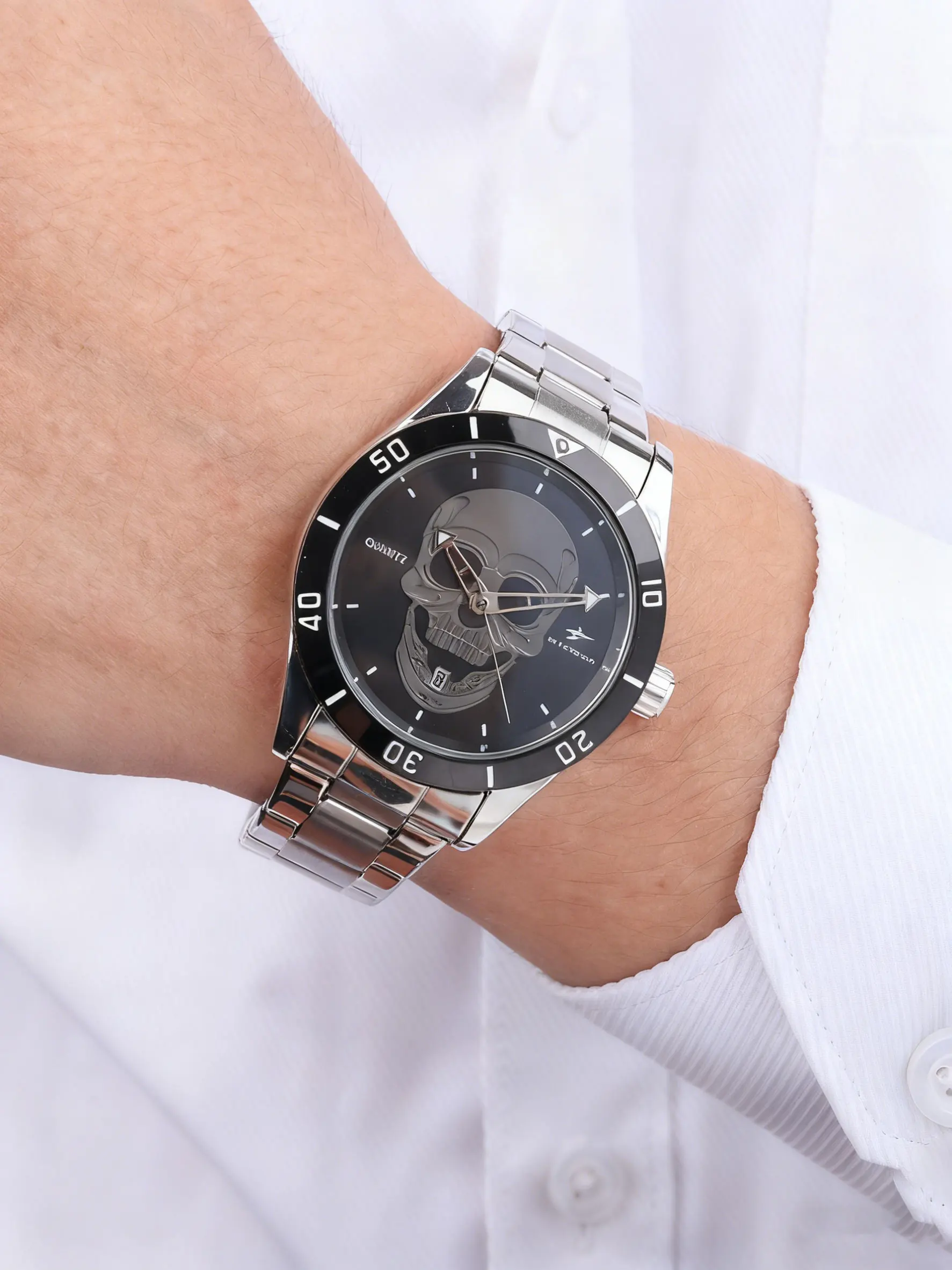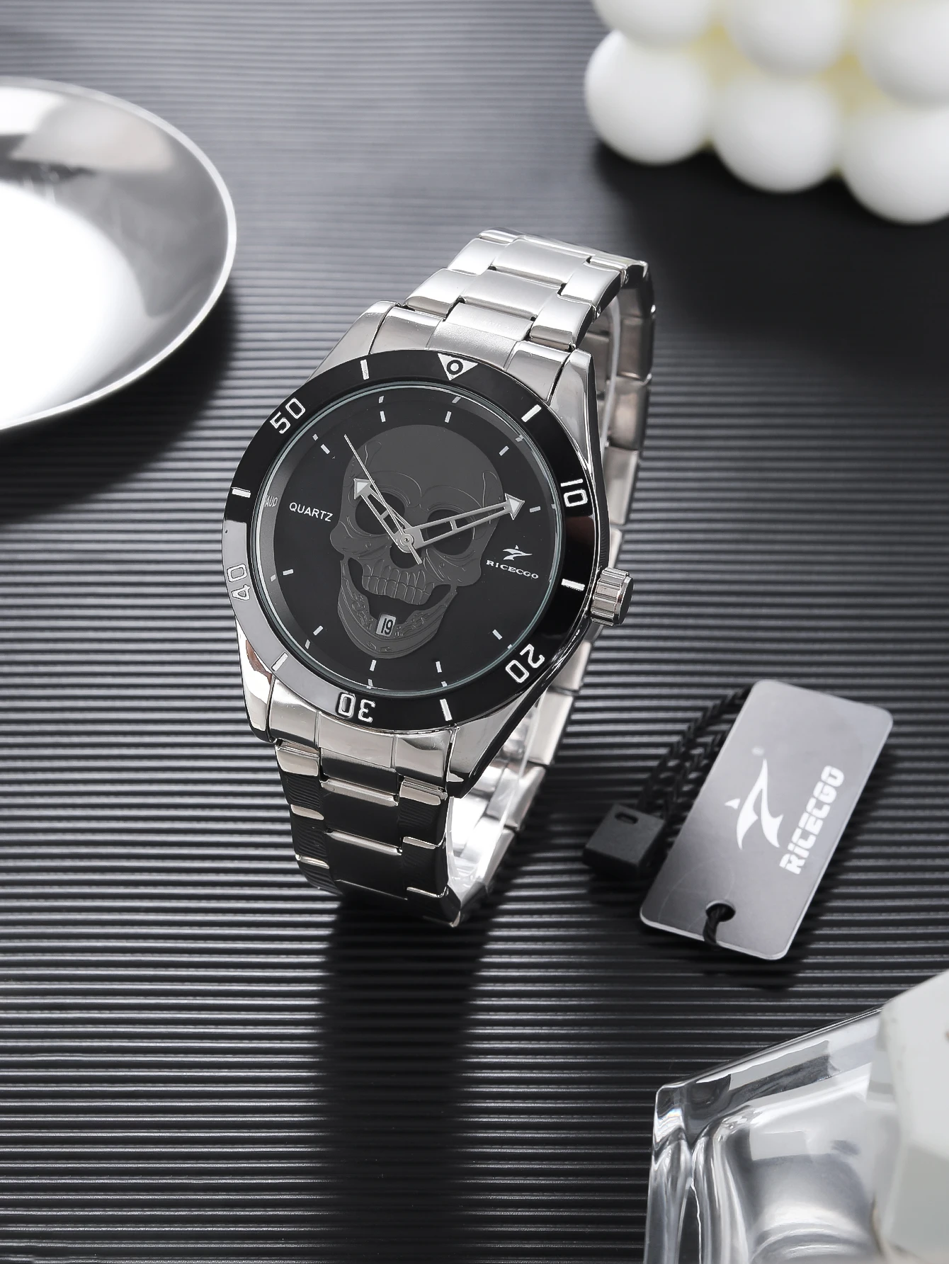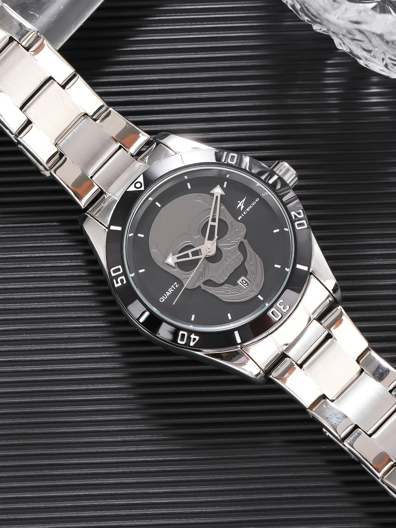 The detailed skull design adds a rebellious touch, while the precise quartz movement ensures accurate timekeeping for everyday use. A built-in calendar display keeps you on track, making it as practical as it is eye-catching.