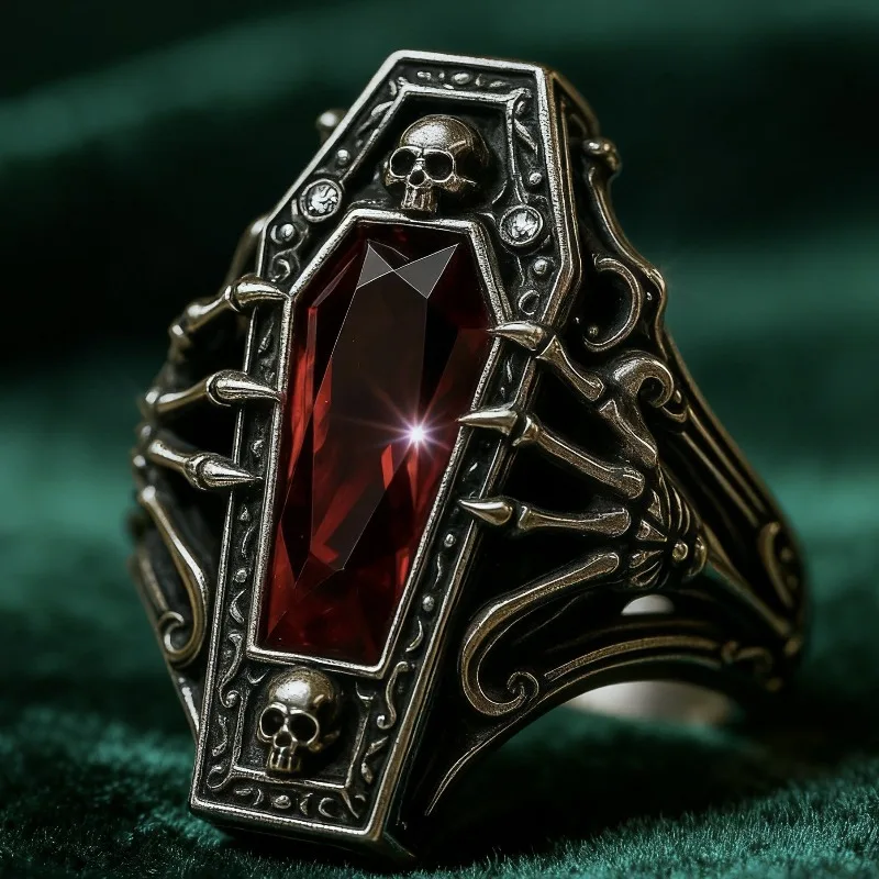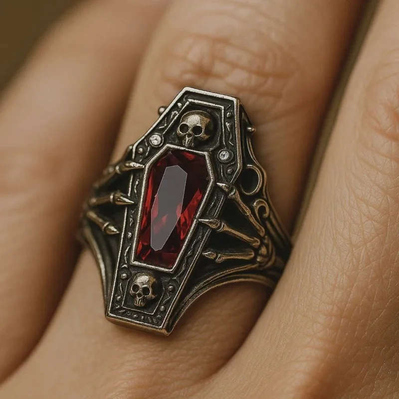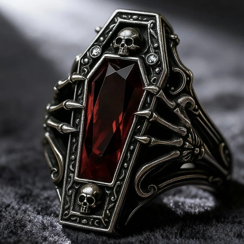 At the center, a striking blood-red zircon stone glows like fire, giving the skull design an intense and mysterious vibe. The detailed craftsmanship highlights every curve and texture, creating a powerful accessory that stands out in any setting.