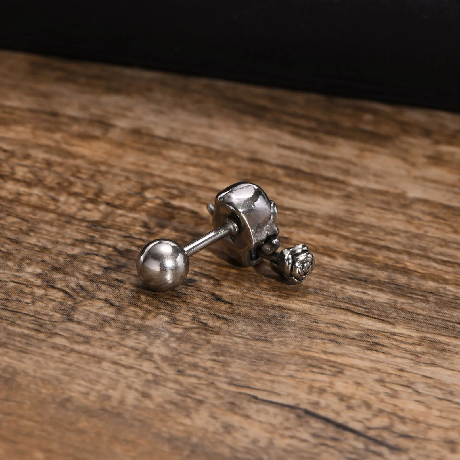 Men’s Gothic Skull Stud Earrings – Waterproof Stainless Steel Punk Skeleton with Rose