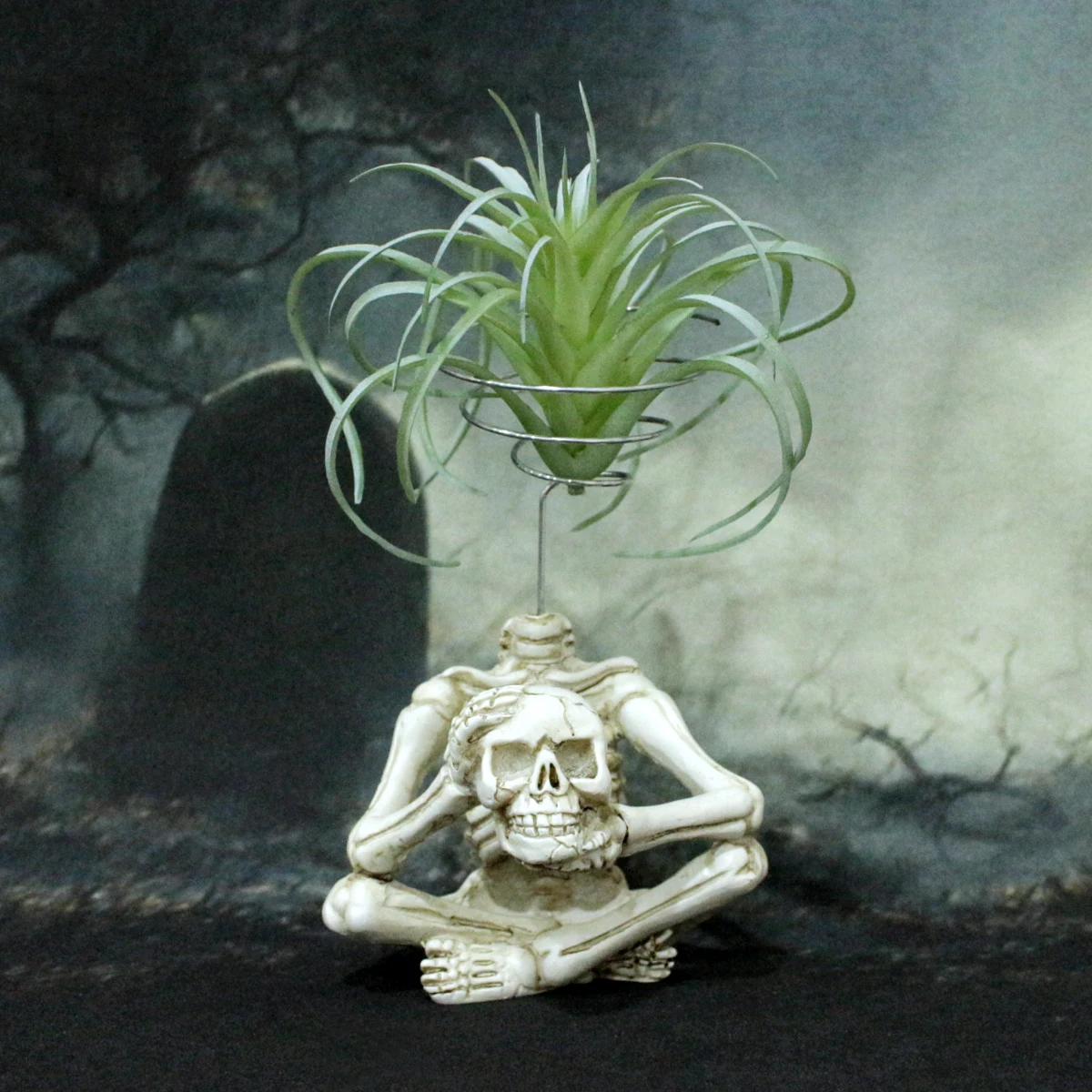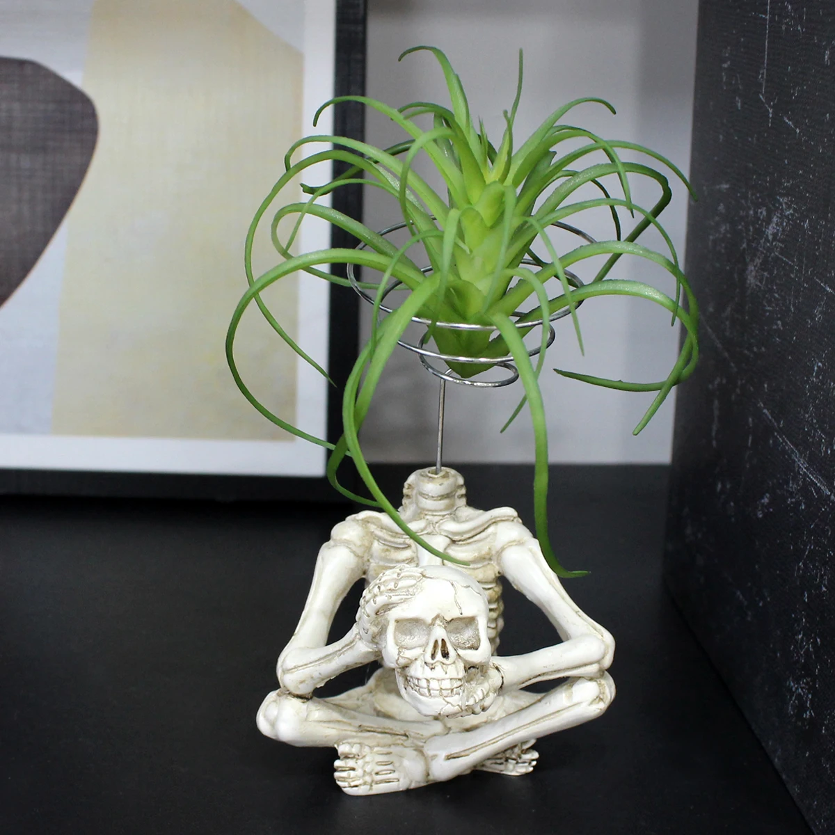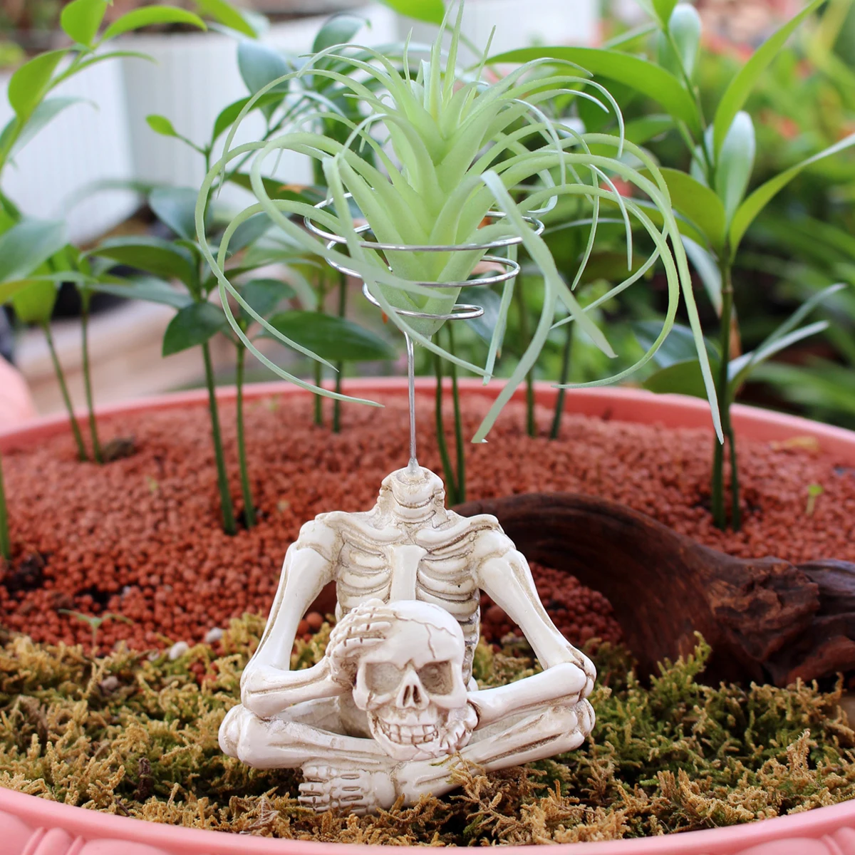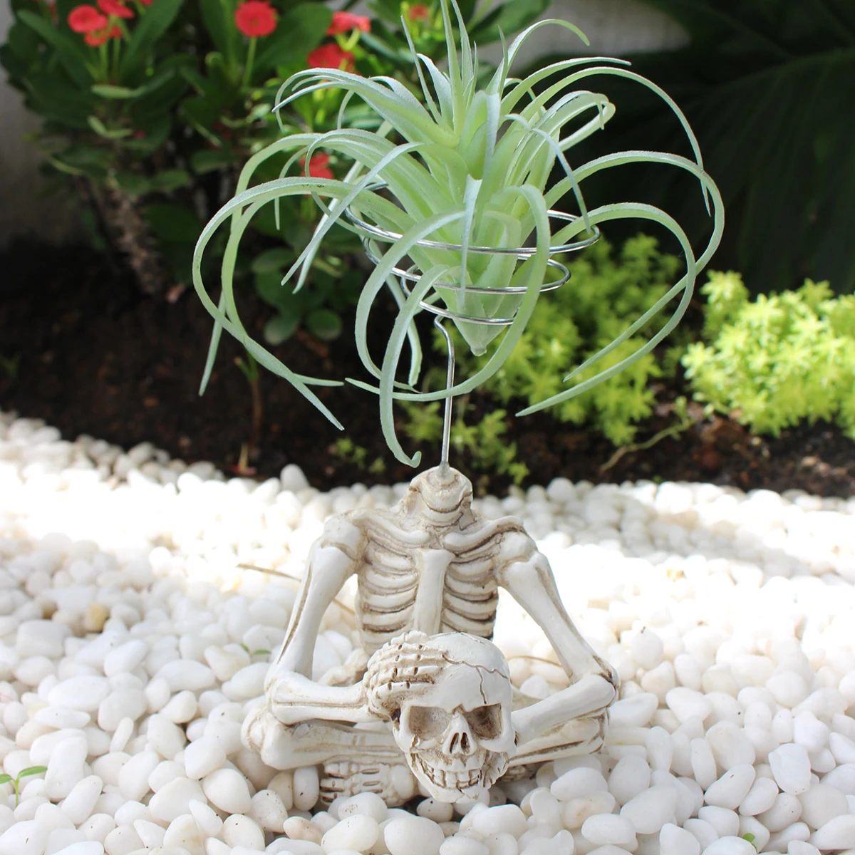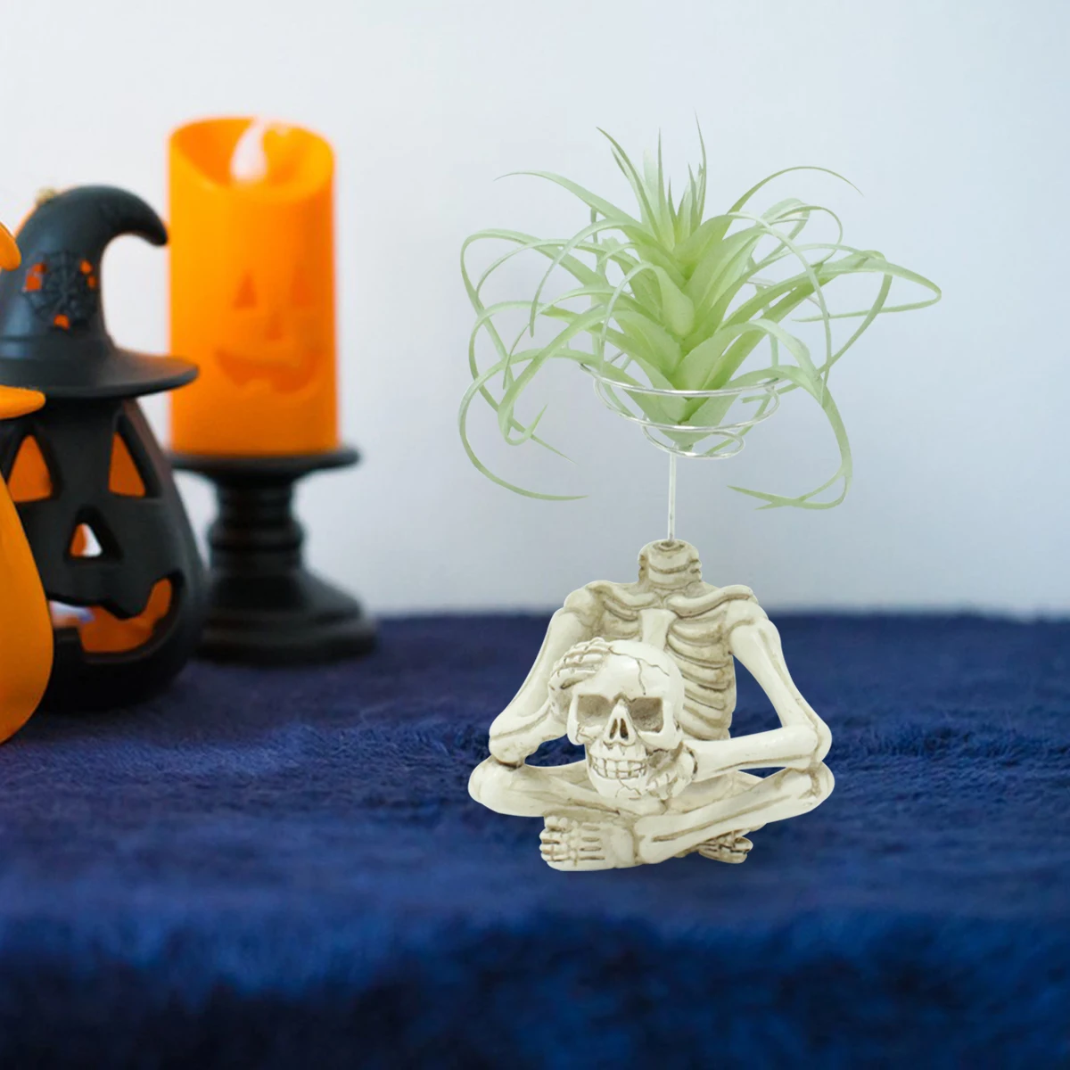 A spooky skeleton in a relaxed, seated pose supports a coiled holder perfect for small air plants, incense, or mini decorations. -