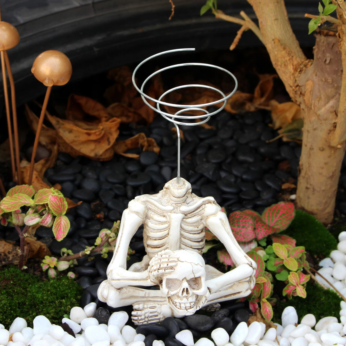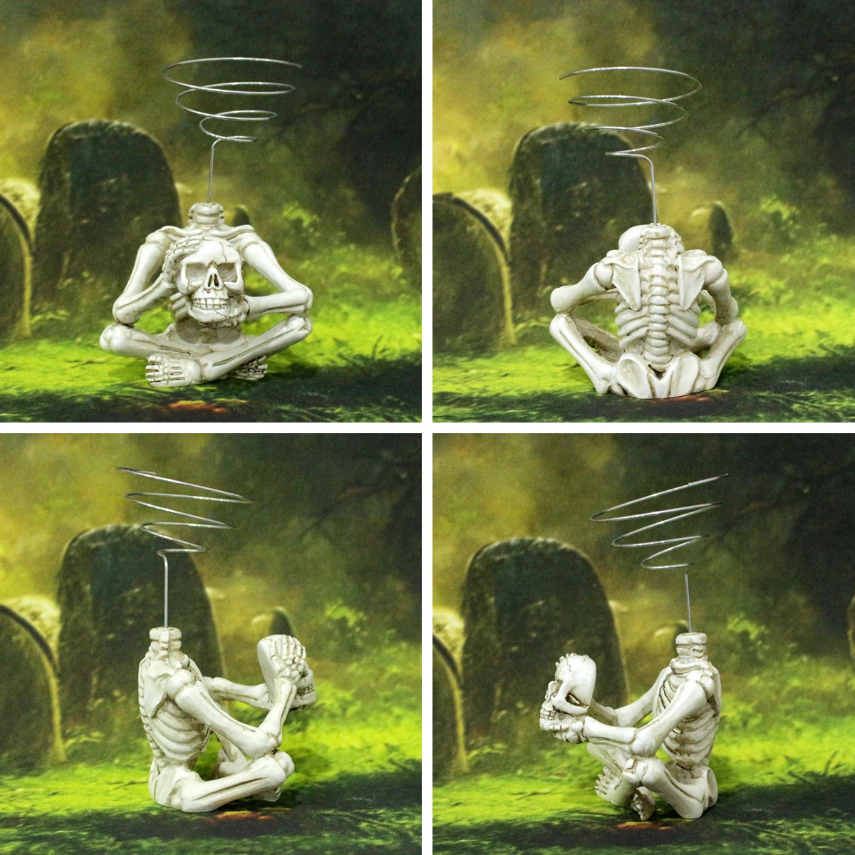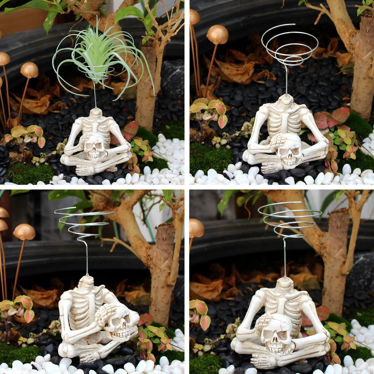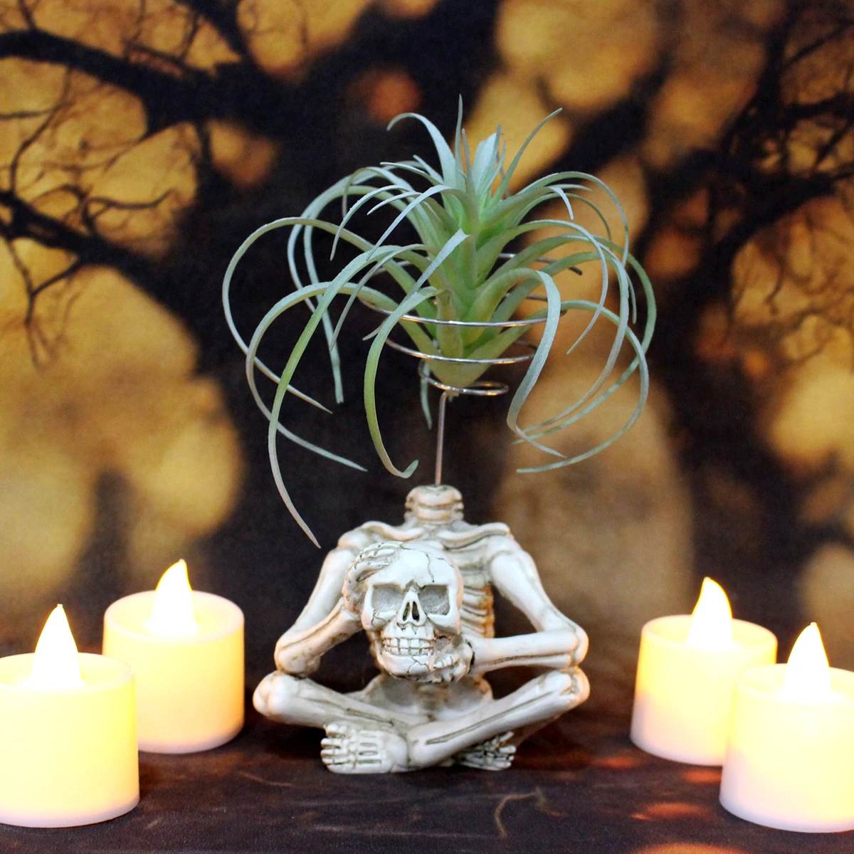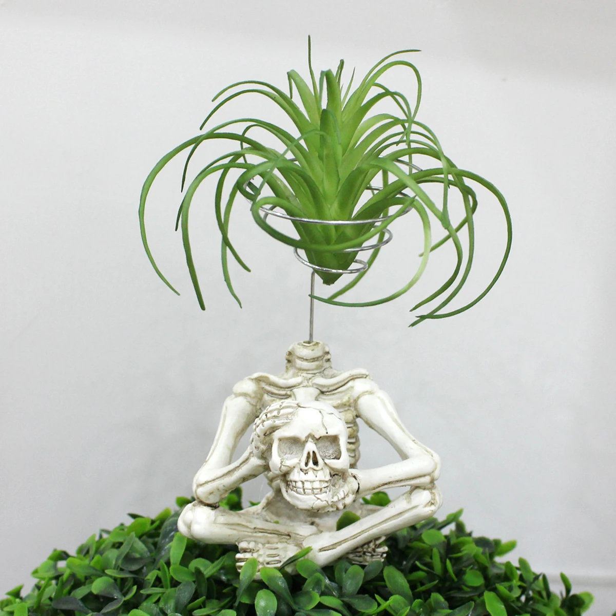 A spooky skeleton in a relaxed, seated pose supports a coiled holder perfect for small air plants, incense, or mini decorations. -